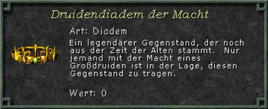 Give = "Nur wenige Menschen erinnern sich daran, aber vor langer Zeit war der Druidenzirkel im Murmelwald kein gefährlicher Ort. Meine Großmutter Amerena lebte dort und pflegte gemeinsam mit ihren Brüdern den Wald. Leider fielen sie eines Tages einem bösen Beschwörer zum Opfer, der den Druidenzirkel mit seinen Abscheulichkeiten überflutete. Ich glaube nicht, dass er hinter Amerenas Diadem her war. Nur diejenigen meiner Blutlinie können seine Kraft nutzen. Das Diadem könnte noch immer in der Vertiefung liegen, es sieht aus wie eine billige Krone, die es nicht wert ist, verkauft zu werden. Mit ihm könnte ich auf die Erinnerungen meiner Großmutter zugreifen und ihr Vermächtnis wiederherstellen. Der Ort wimmelt von Kreaturen, die ich nicht besiegen kann. Könnt Ihr versuchen, den Druidenzirkel zu säubern und mir das Diadem zurückbringen, falls es tatsächlich noch dort ist?",